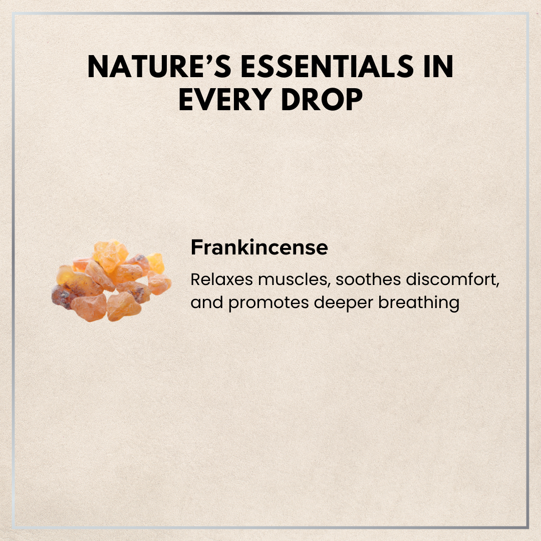- Frankincense – Relaxes muscles, soothes discomfort, and promotes deeper breathing